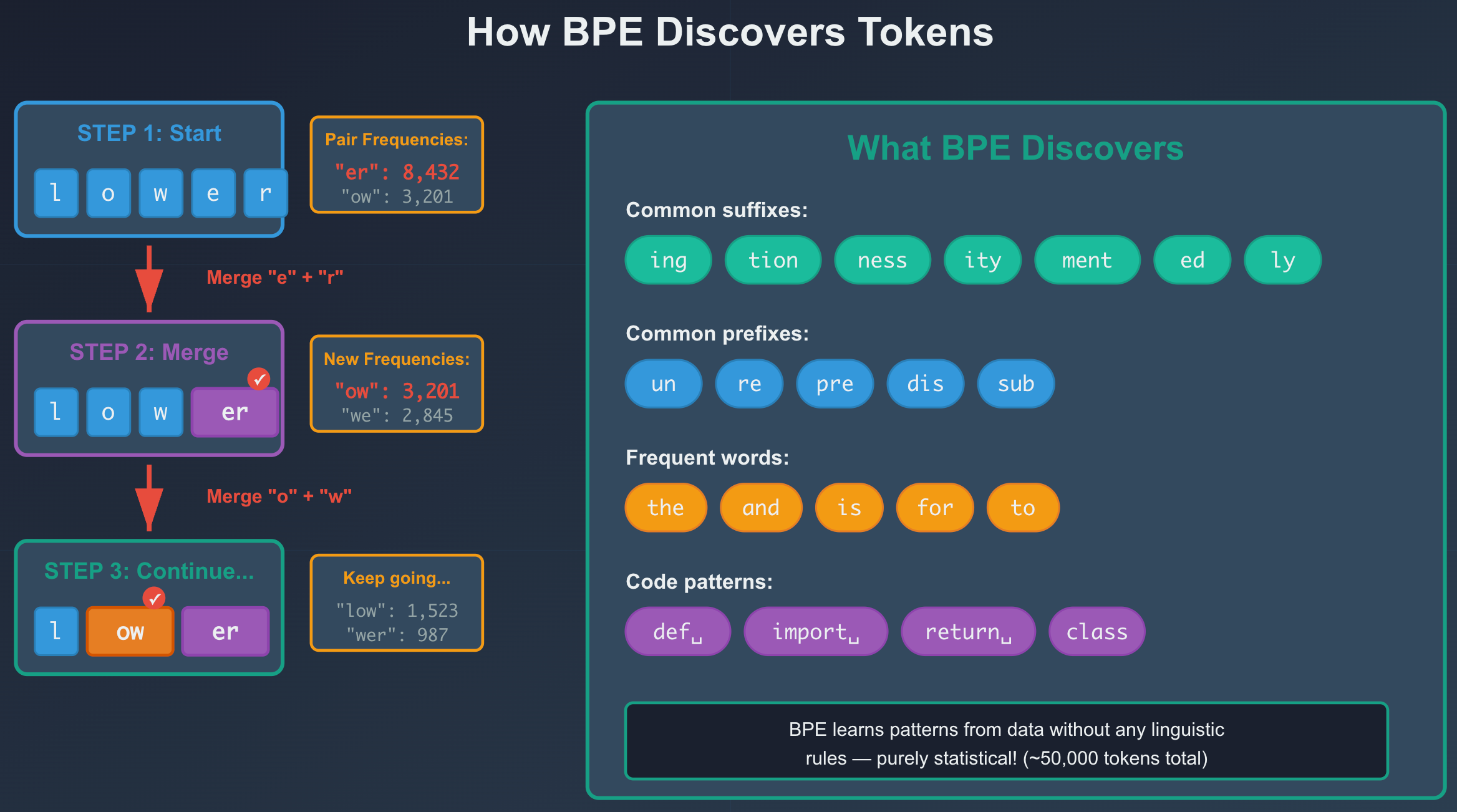 Why “GPT-4” becomes 3 tokens: The tokenizer sees ‘G’ as rare enough to be separate, ‘PT’ as a common chunk (from words like “ception”), and ‘-4’ as a number with punctuation. This is why brand names and technical identifiers often tokenize unexpectedly.