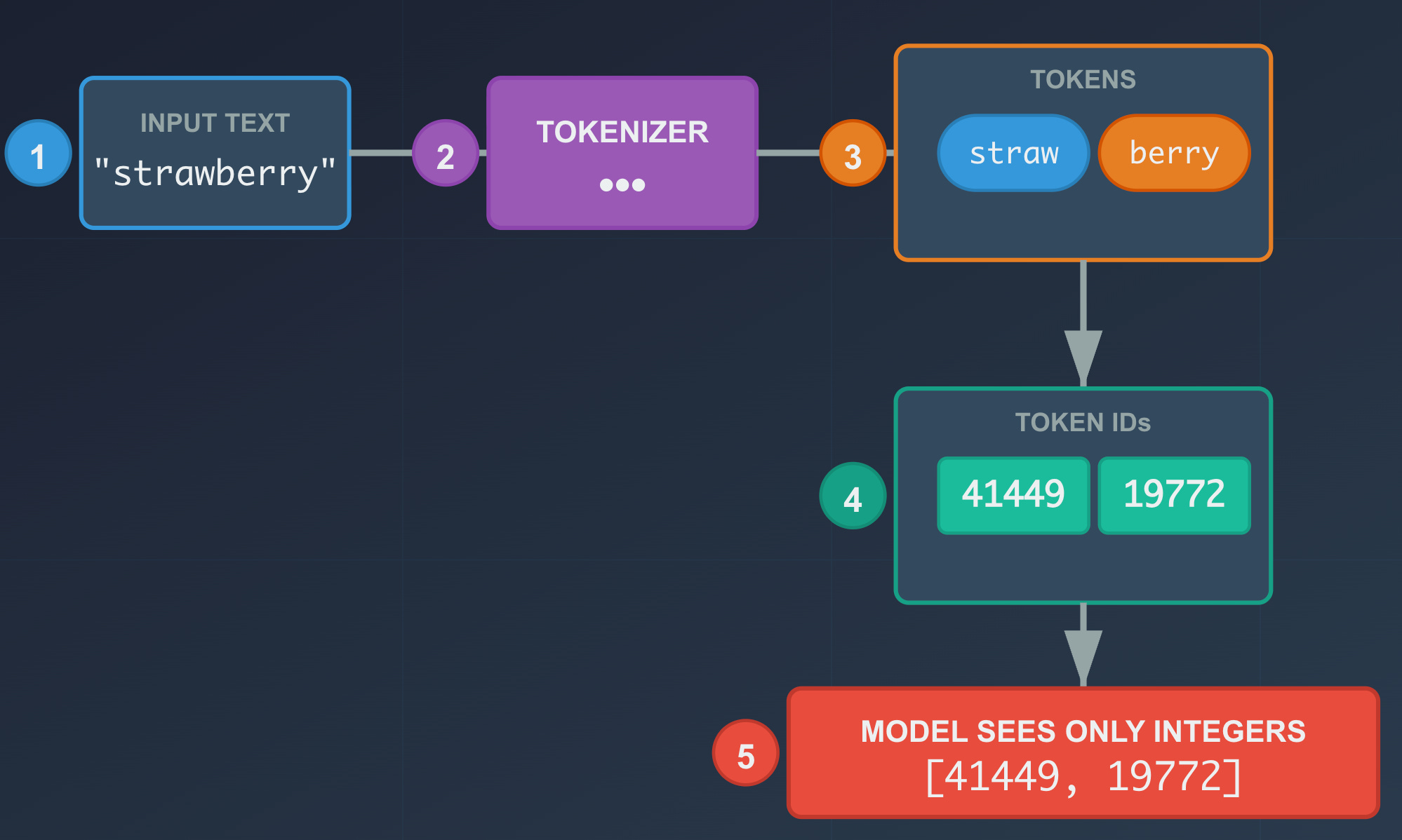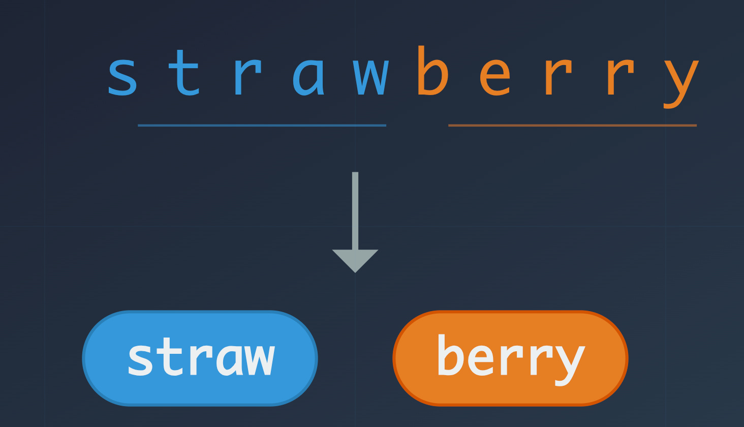 When you type “strawberry,” the model does not see s-t-r-a-w-b-e-r-r-y. It sees two tokens, something like: