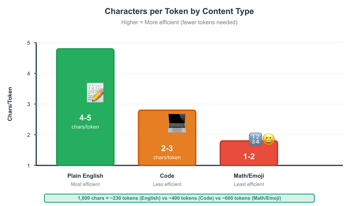 Content Type Typical Chars/Token Plain English prose 4-5, Code 2-3, Math notation, emoji, rare symbols 1-2